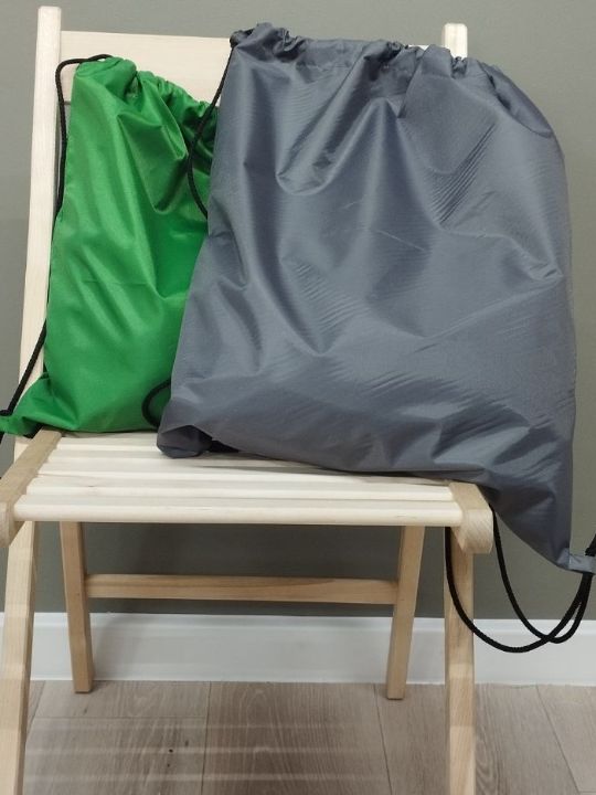 Мешок рюкзак для обуви и одежды. Сшит из плотного оксфорда с водоотталкивающей пропиткой. Состоит из одного вместительного отделения, закрывается путём затягивания шнурков их длина регулируется за счёт фиксатора (стопора). Длина лямок позволяет повесить мешок на спину. Диаметр шнурка составляет 5 мм. Сумка-мешок изготавливается в двух размерах: большой - 49*41 см; маленький - 34*42 см.